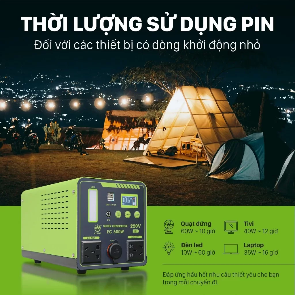 – Thời gian sử dụng dài: Từ 6-8 giờ tùy vào công suất thiết bị.